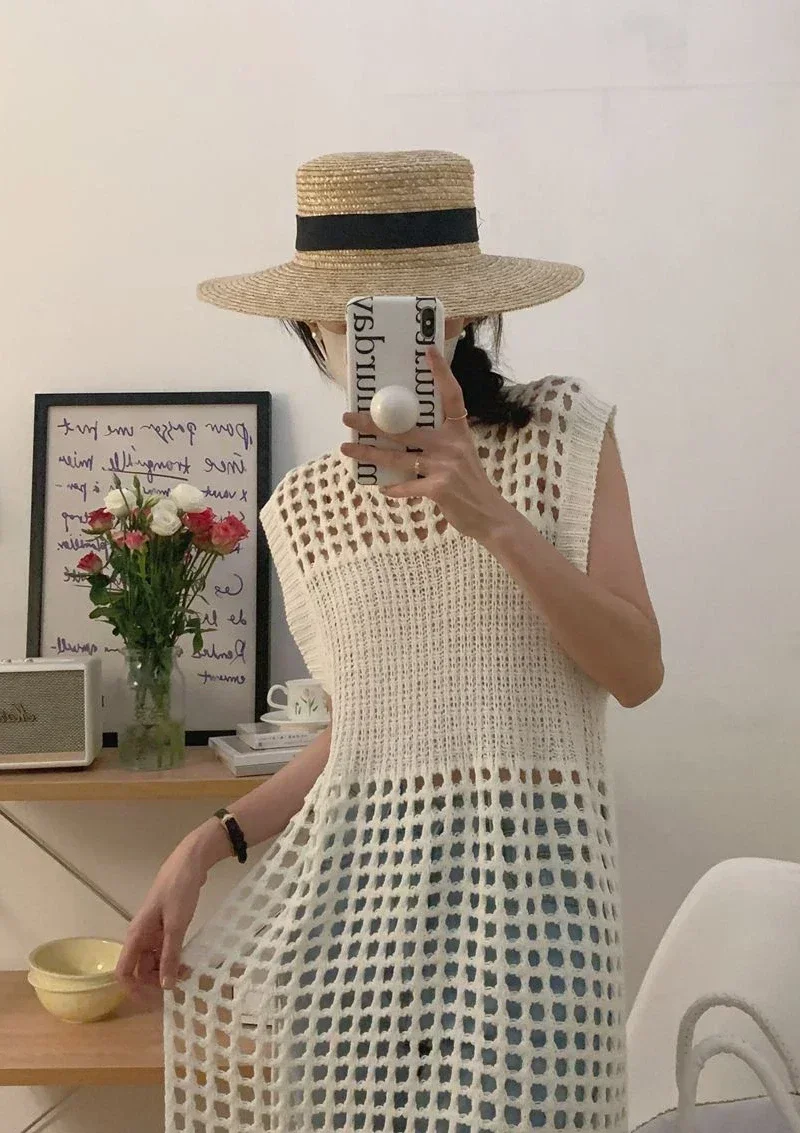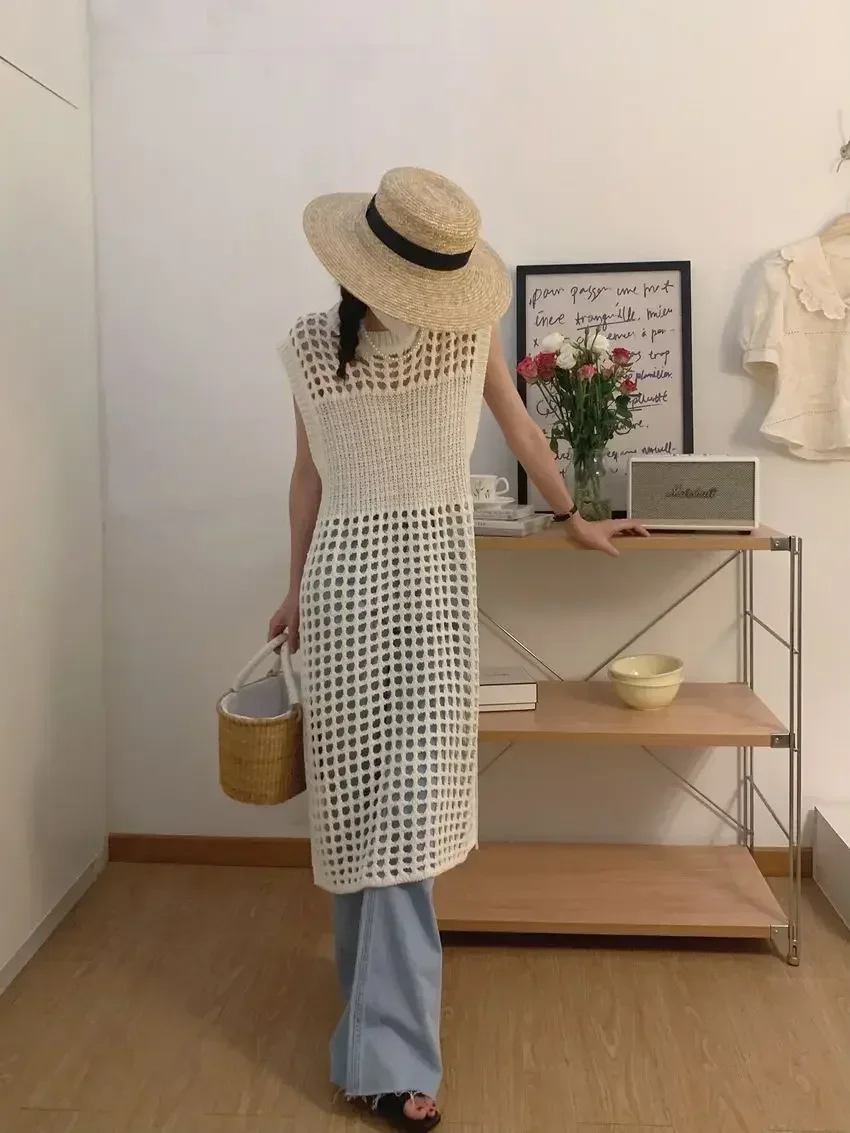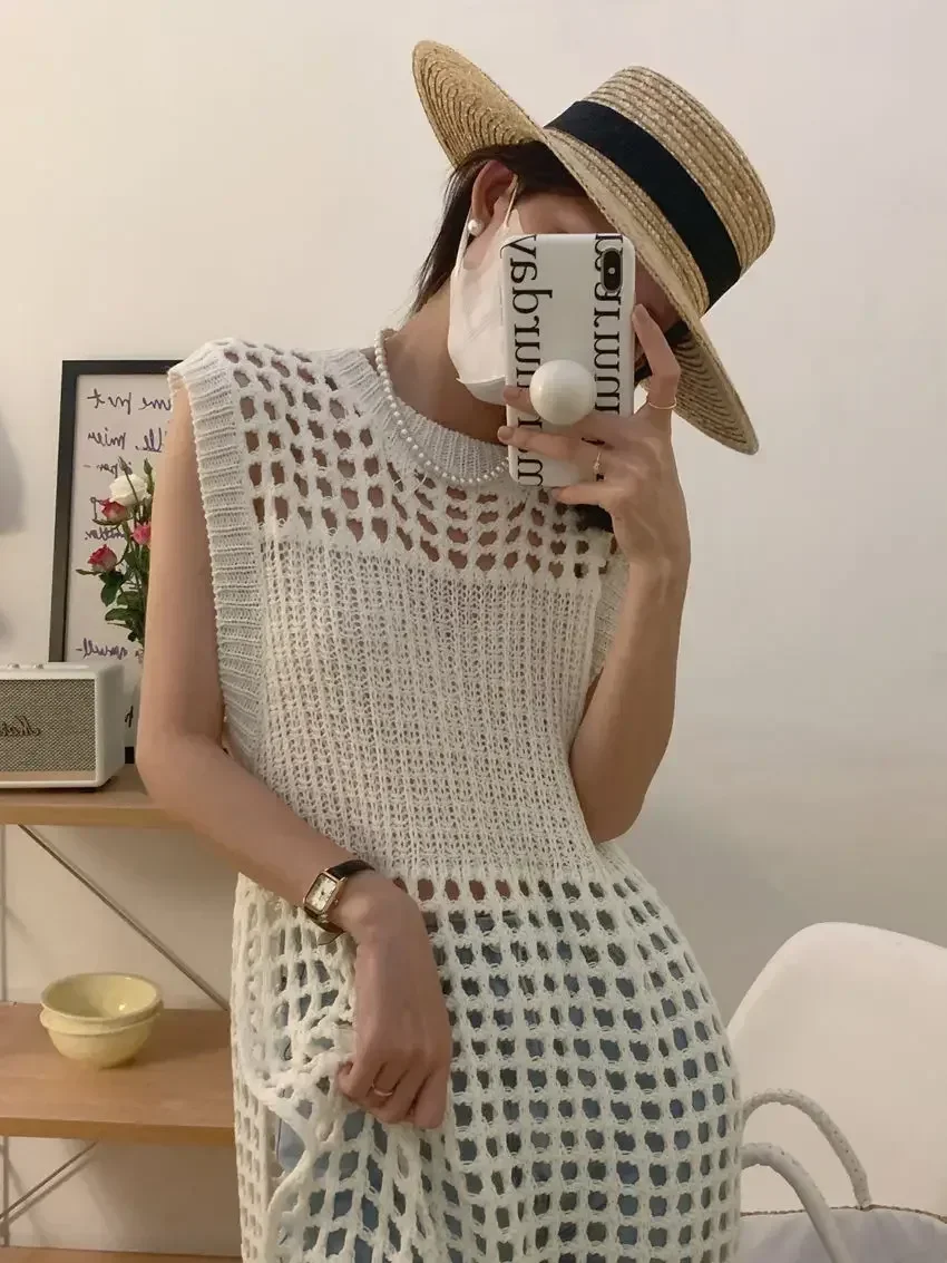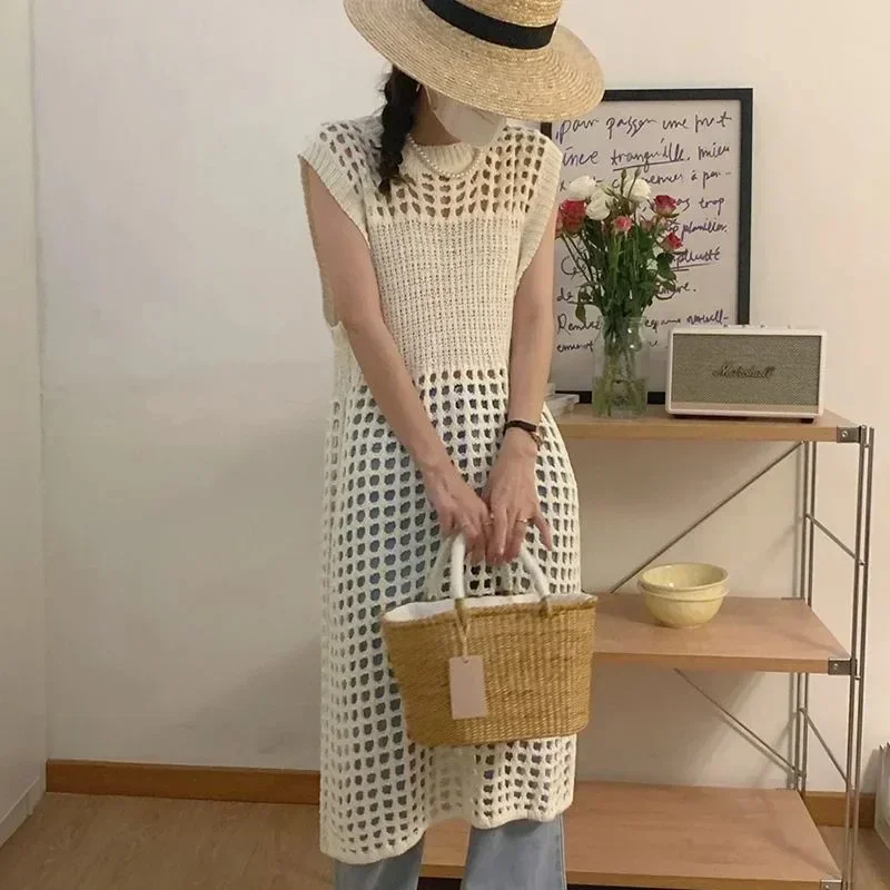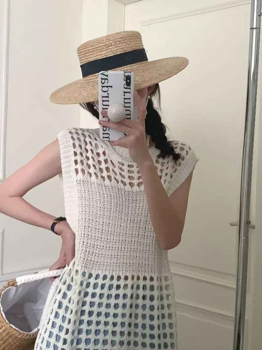 TKNOLEGE Knitted Dress Hollow French Style Fashion O-neck Out Design Sleeveless Solid Casual Tender Holiday Chic Ladies Dress