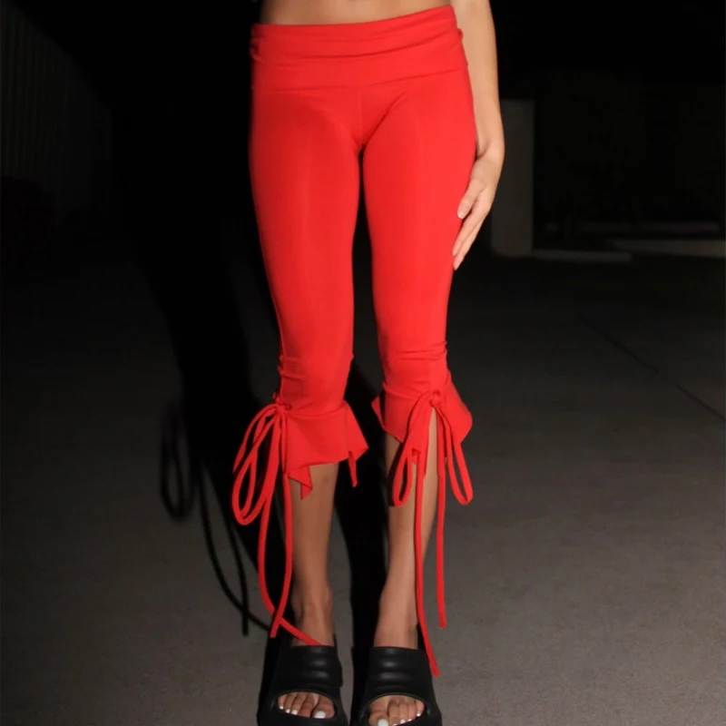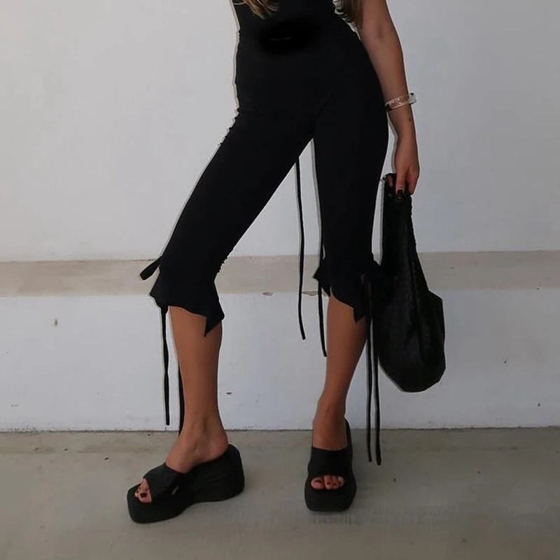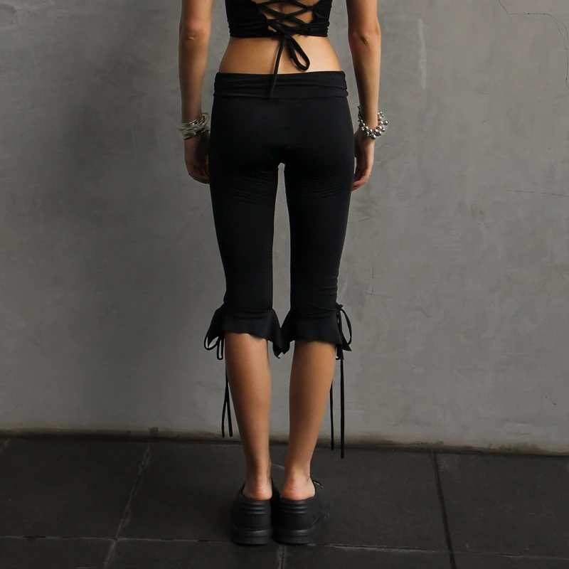 Vintage Tie-up Ruffles Hem Short Pants Y2k Knee Length Capri Trousers Women Folds Low Waist Skinny Pants Fashion High Street