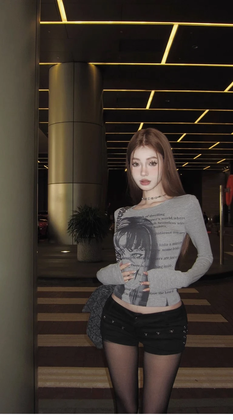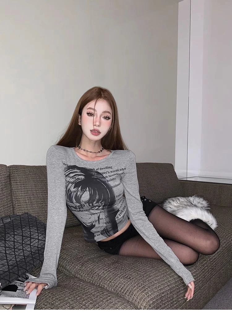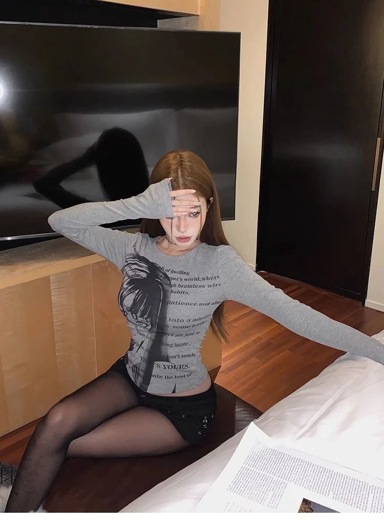 Vintage Women Y2K Clothes T-shirt Cotto Blusas O-neck Long Sleeve Tops Print Tunic Grunge Woman Clothing Fashion Casual Crop Top