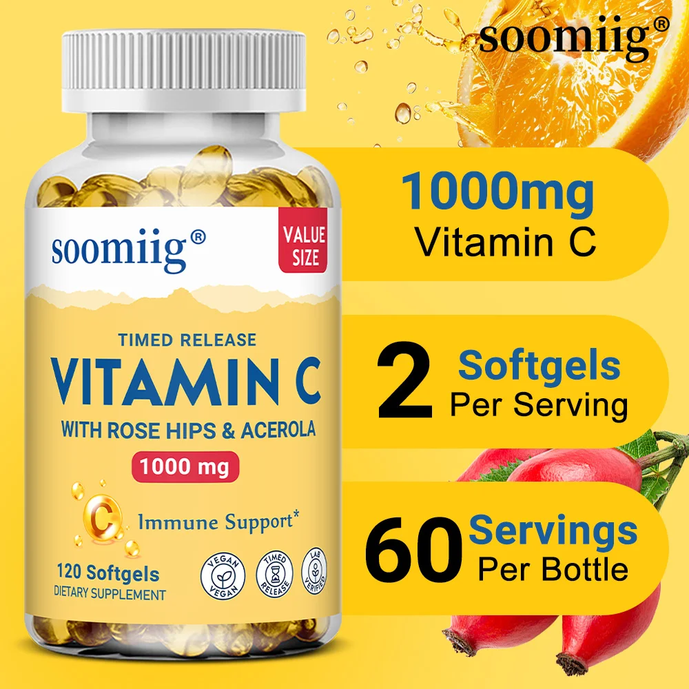 Vitamin C W/Rose Hips & Acerola | 1000mg | Two-Stage Timed-Release Healthy Immune Function, Skin, Hair & Nails Support | Non-GMO