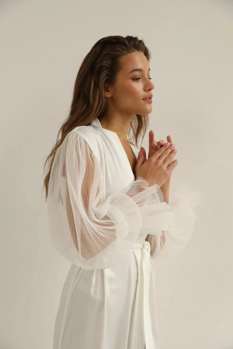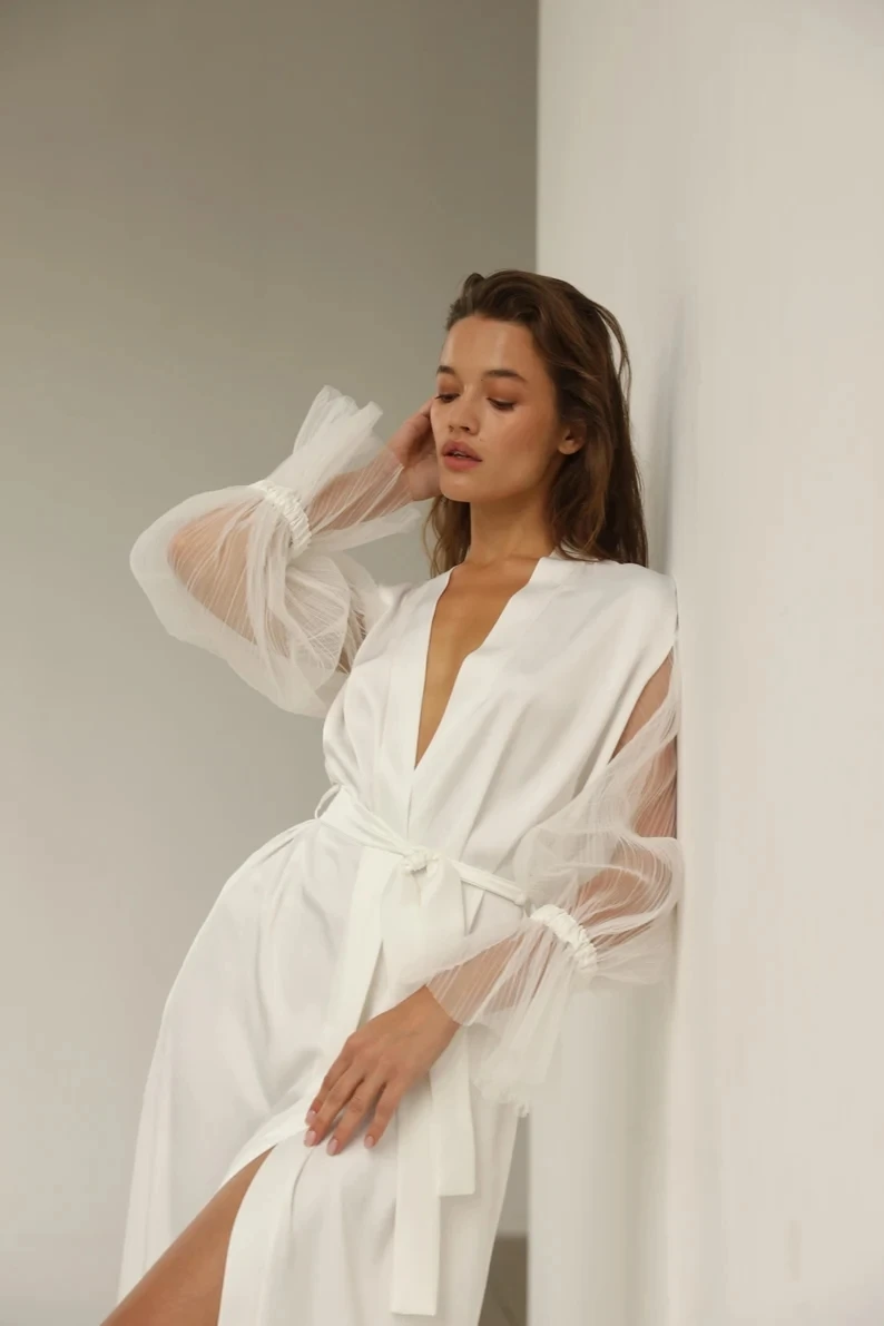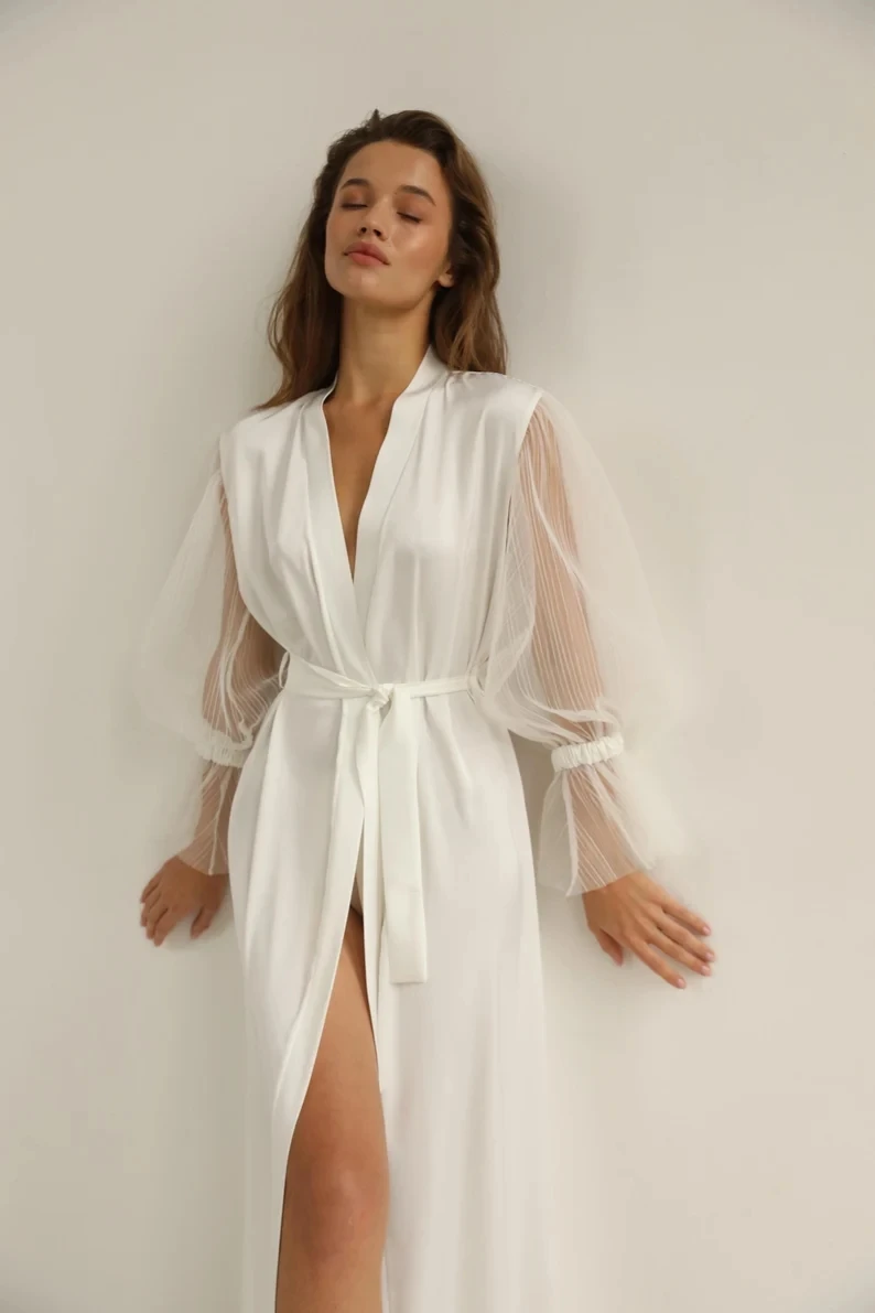 White Bridal Silk Gown With Wide Sleeves Robe Satin Boudoir Wedding Dress Floor-Length Robe Women's Gown Satin Silk Party Dress
