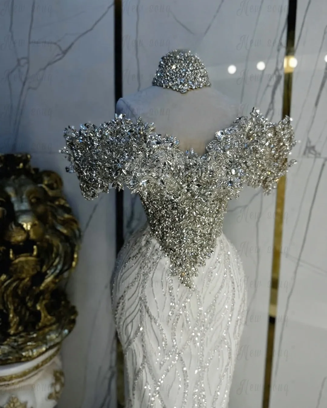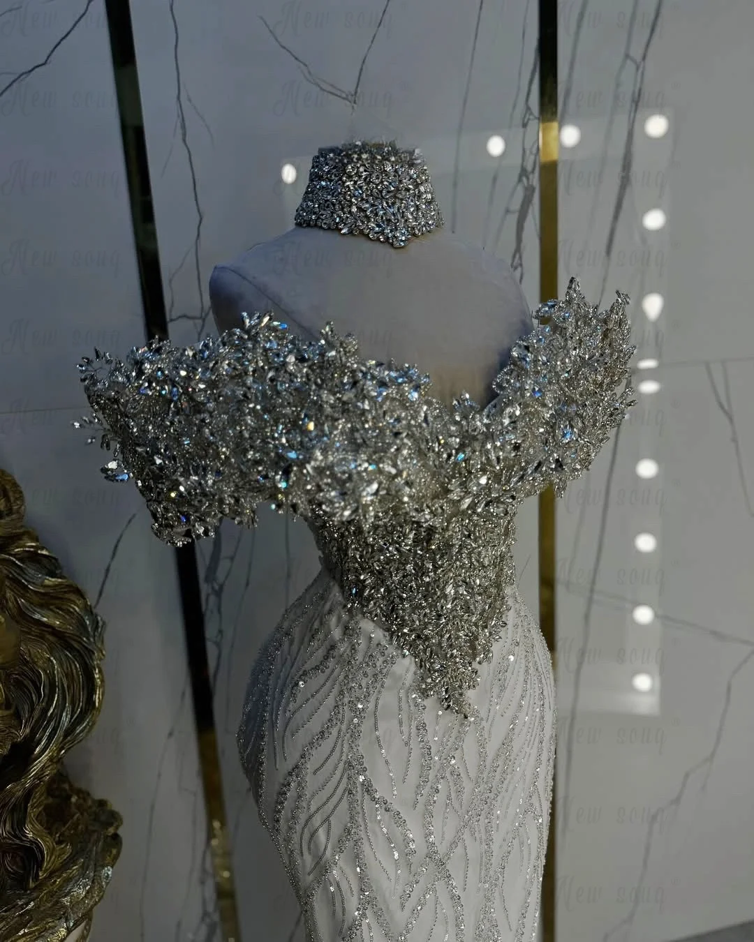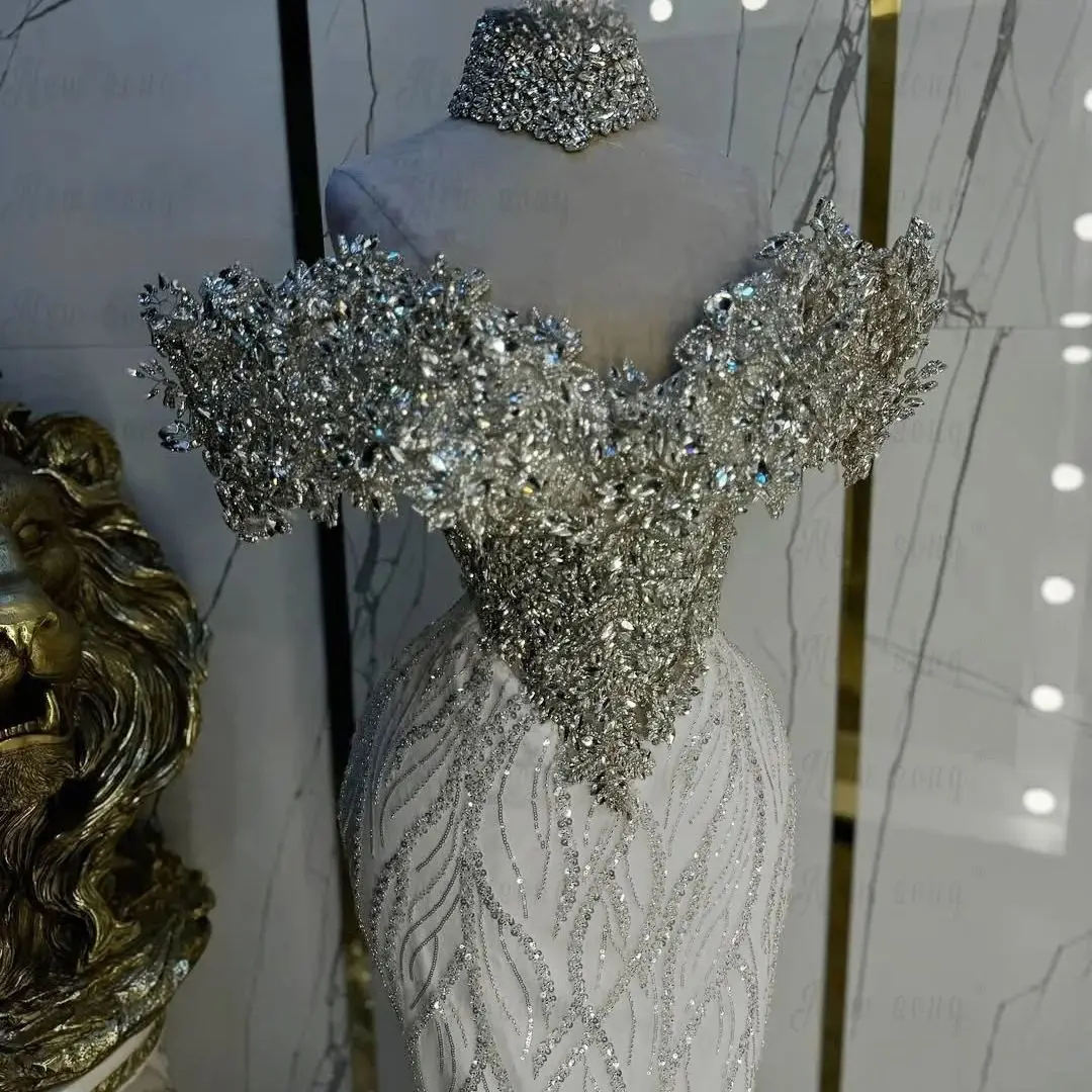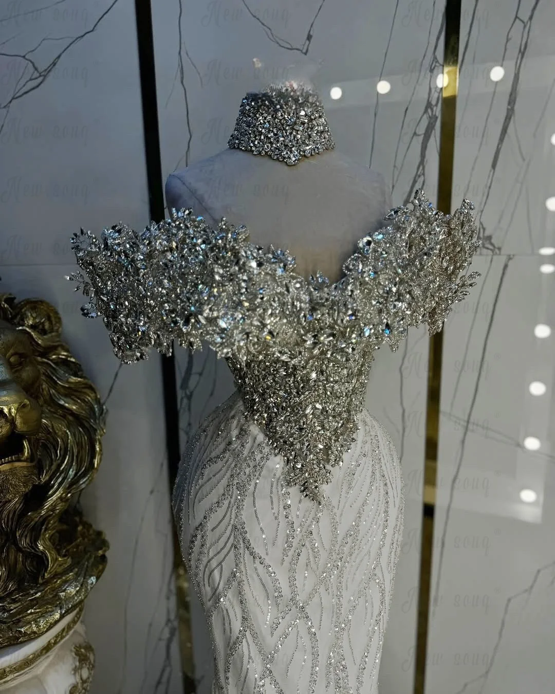 White Long Evening Dress 2025 Luxury Silver Beaded Lace Wedding Party Gowns Dubai Second Reception Dress Bridal Gowns Customized