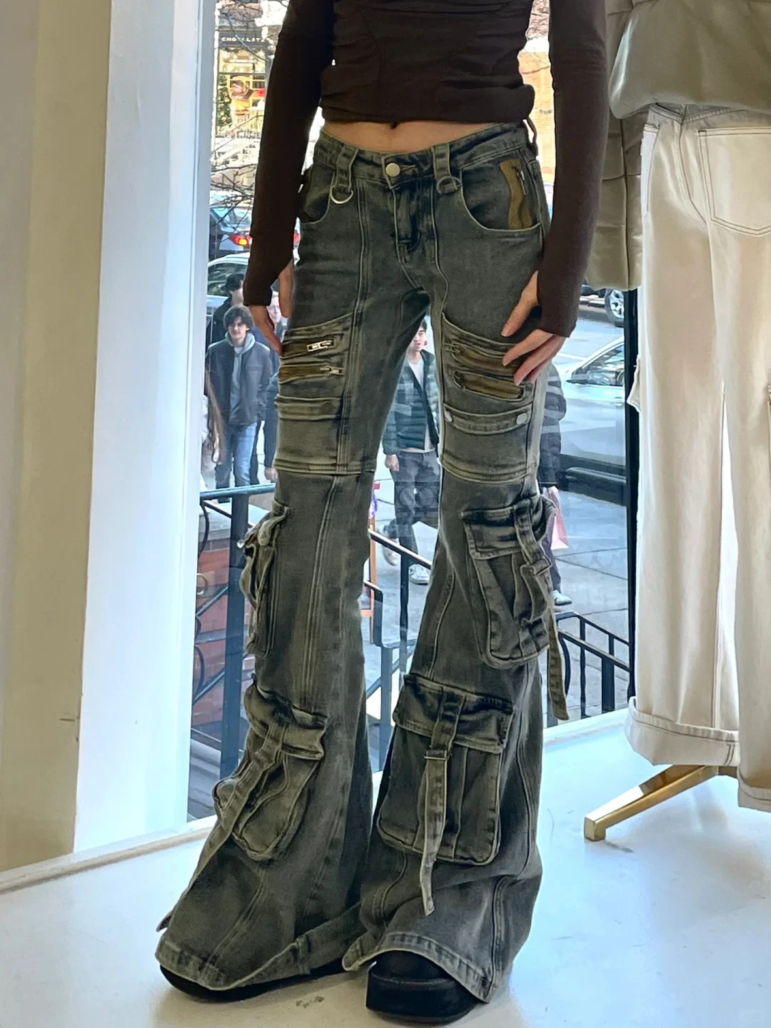 Women Abi Harajuku Y2K Streetwear Pantalones Low Rise Denim Goblin Core Flare Cargo Pants Jean Bell-Bottom Japanese Long Trouser
