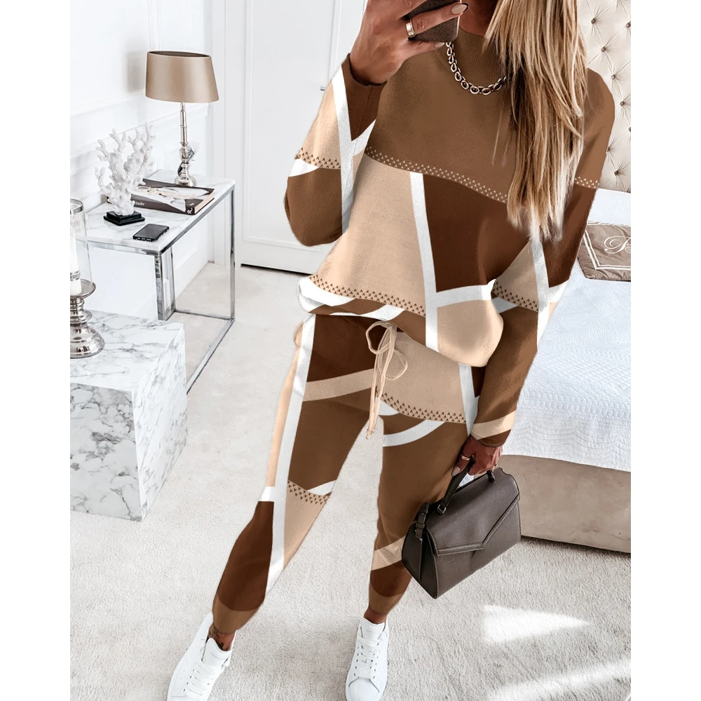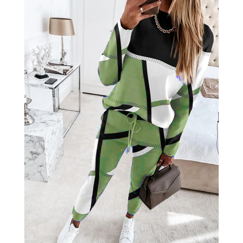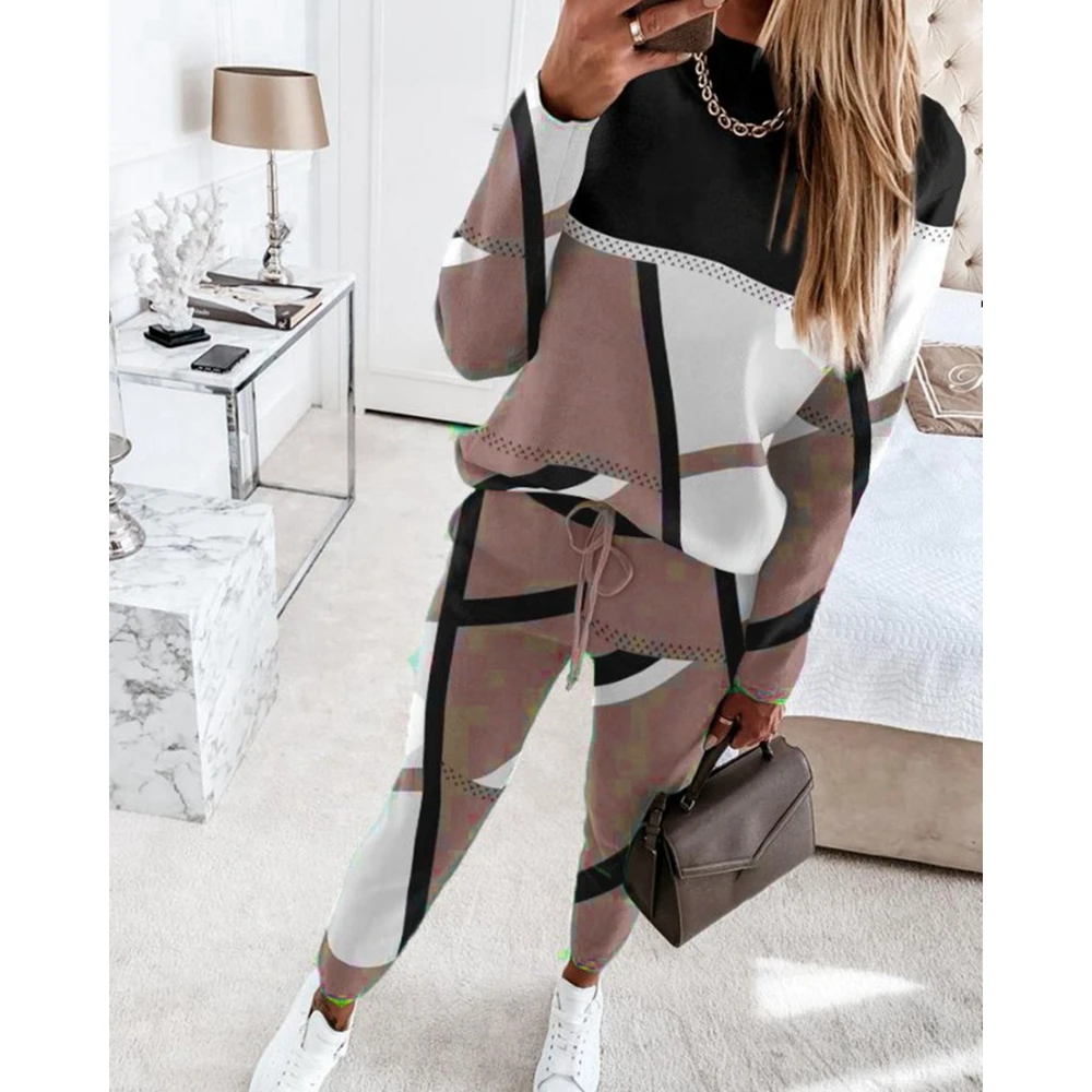 Women Casual Two Piece Sets Fashion Geometric Print O-Neck Long Sleeve Tops and Drawstring Pencil Pants Sets Office Lady Outfits