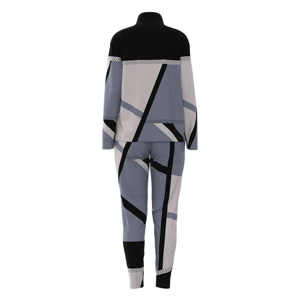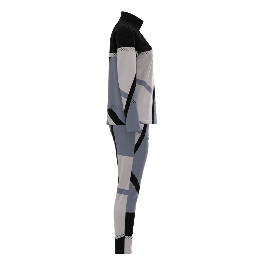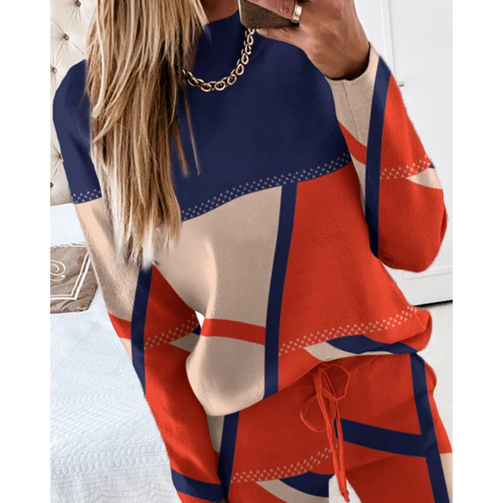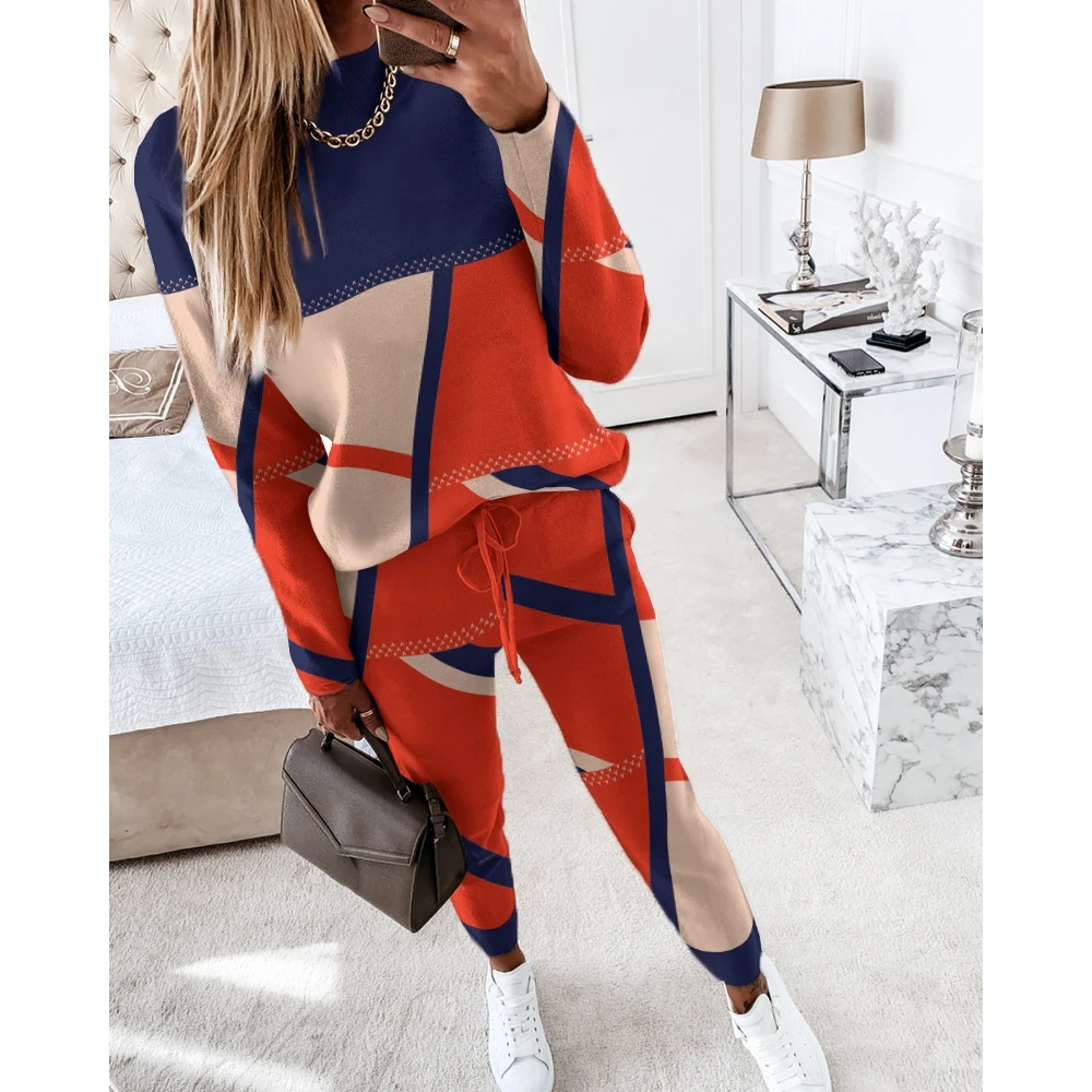 Women Casual Two Piece Sets Fashion Geometric Print O-Neck Long Sleeve Tops and Drawstring Pencil Pants Sets Office Lady Outfits