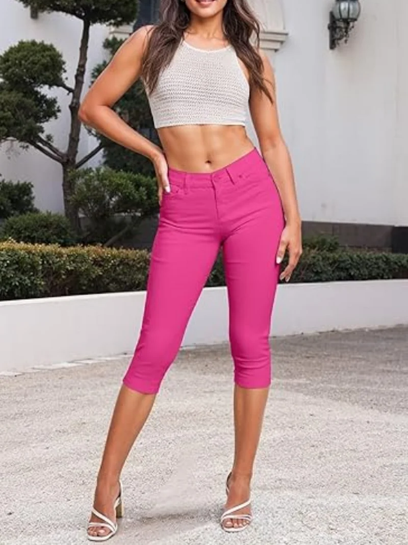 Women Color Capris Pants Stretchy Comfy Skinny Cropped Jeans Pants Button Front Casual Breathable