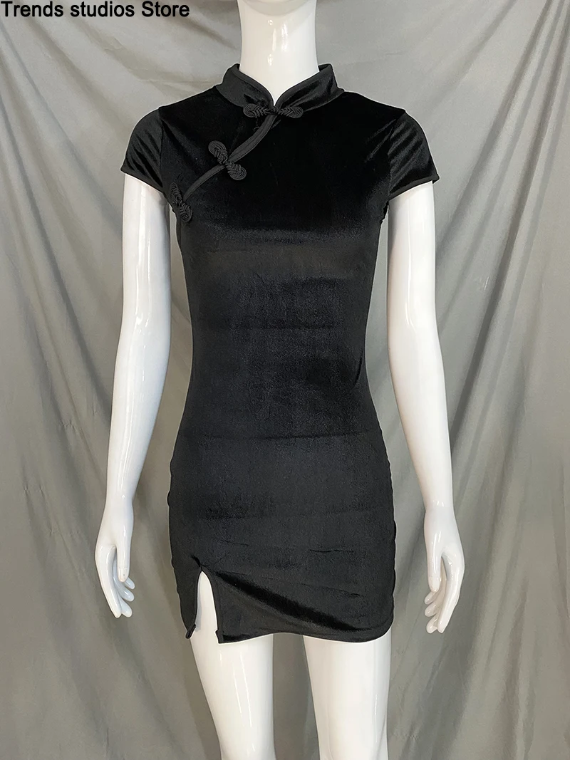 Women Dress Y2K Cheongsam Velvet Elegant Black Sexy Short Sleeve Button Casual Shopping Photo Chinese Dress Tight Fashion Summer