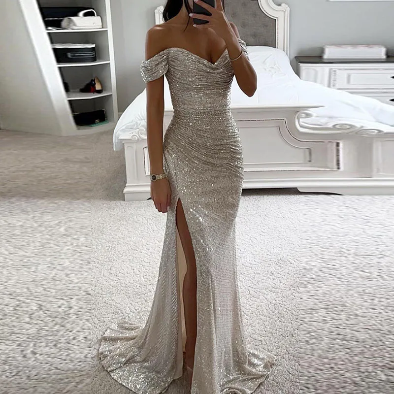 Women Elegant High Slit Cocktails Dress New Lady Party Banquet Slim Sequin Maxi Dress Sexy Slash Neck Glitter Floor-Length Dress