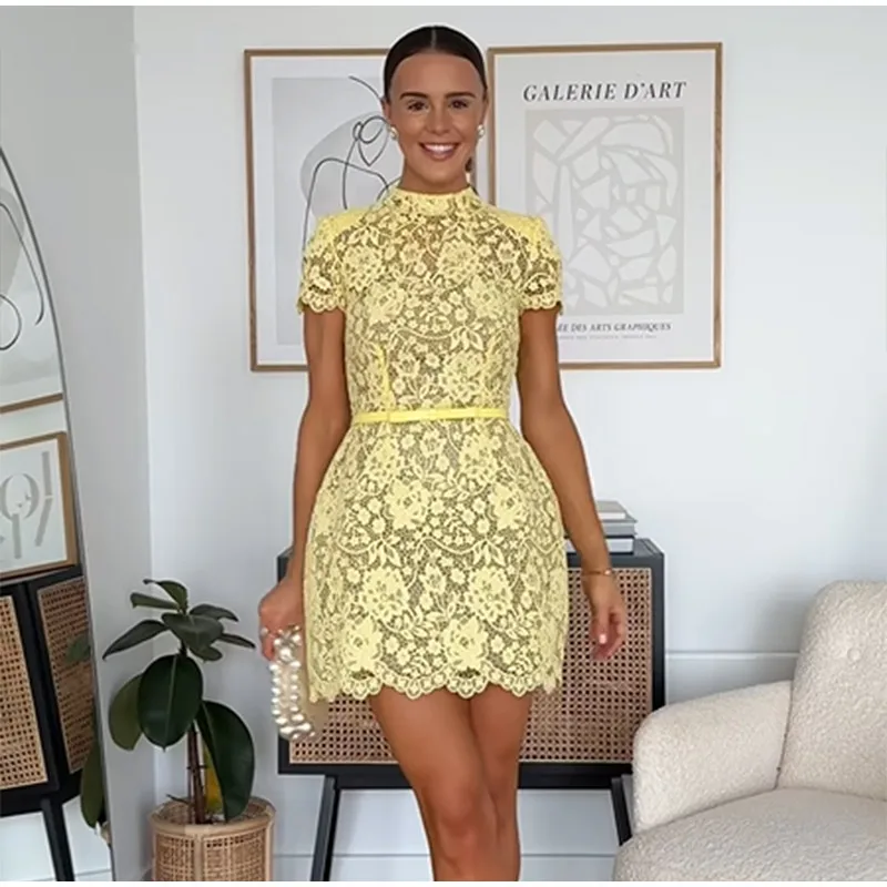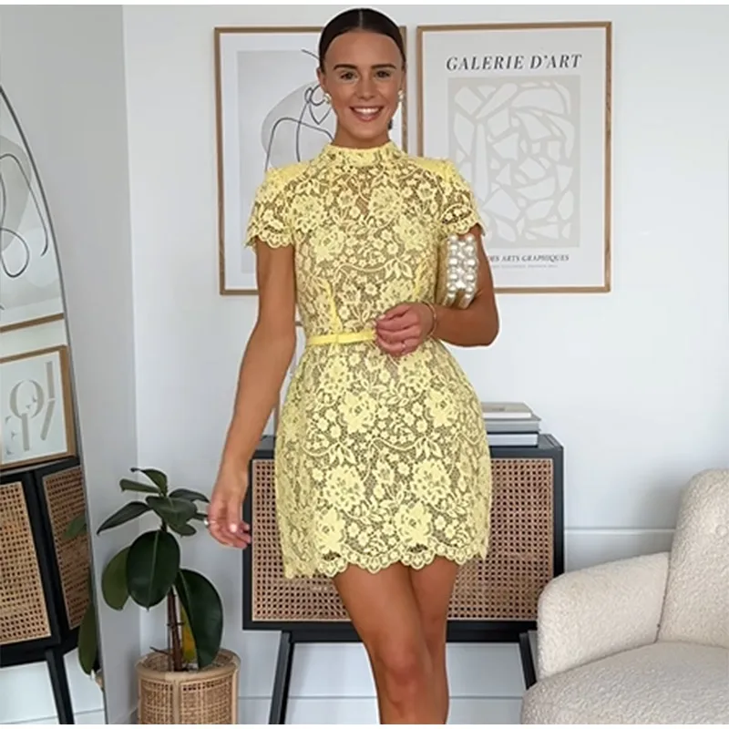Women Fashion Yellow Lace Hollow Out Mini Dress Elegant Short Sleeve High Waist Bodycon Dresses Sexy Party Street Lady Vestidos