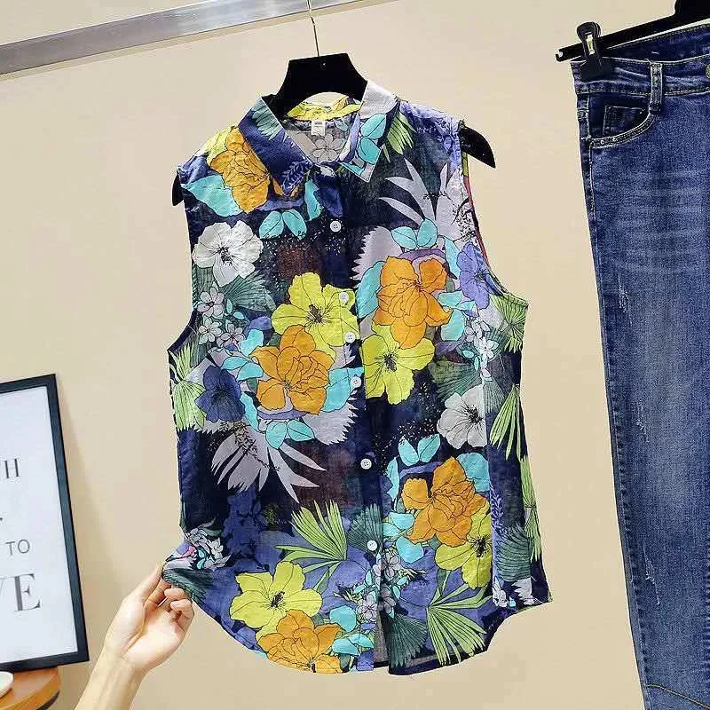 Women Summer Style Blouses Shirts Lady Casual Sleeveless Turn-down Collar Printed Blusas Tops
