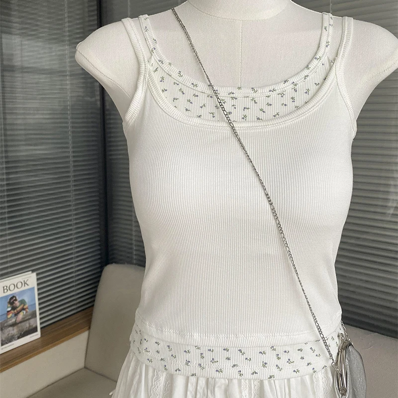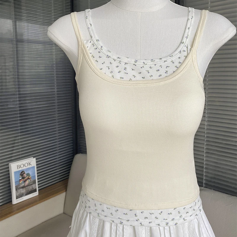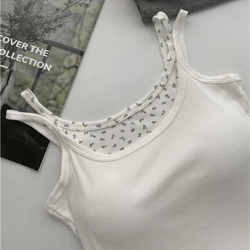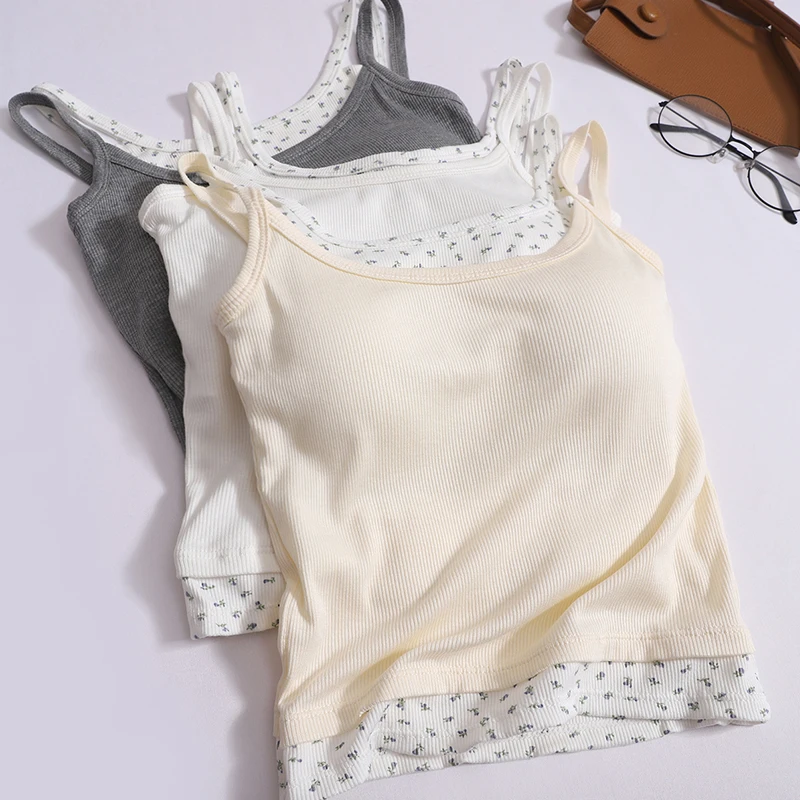 Women Sweet Patchwork Floral Printing Tank Tops With Bra Pad Sexy Off Shoulder Spaghetti Strapy Top Summer Worn Outside Camisole