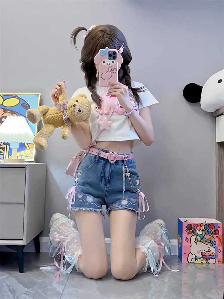 Women's Denim Shorts Strap Cute High Waist Bow Kawaii Female Short Jeans Pants Elegant New in To Wear Stretchy Trend 2025 Casual