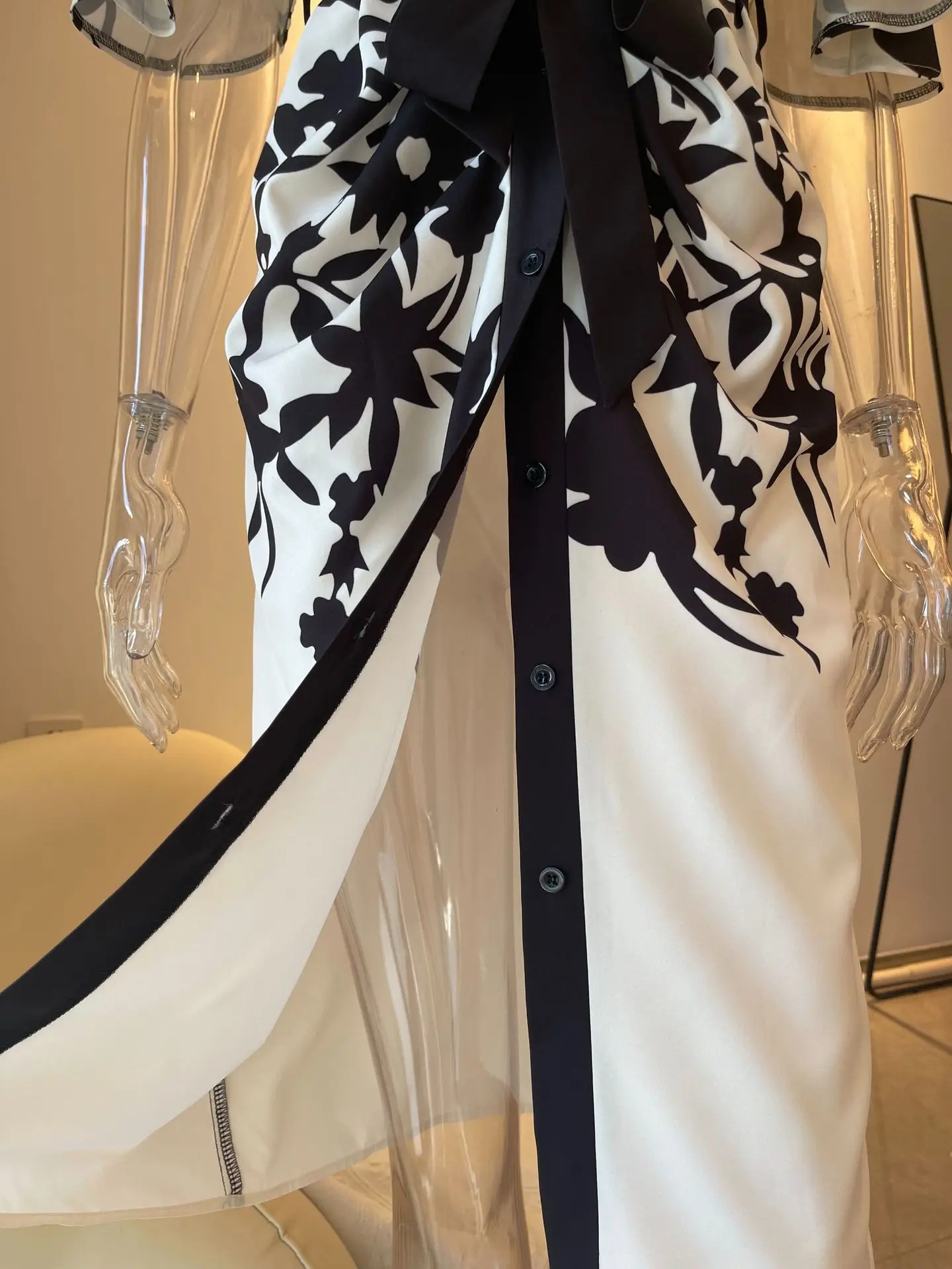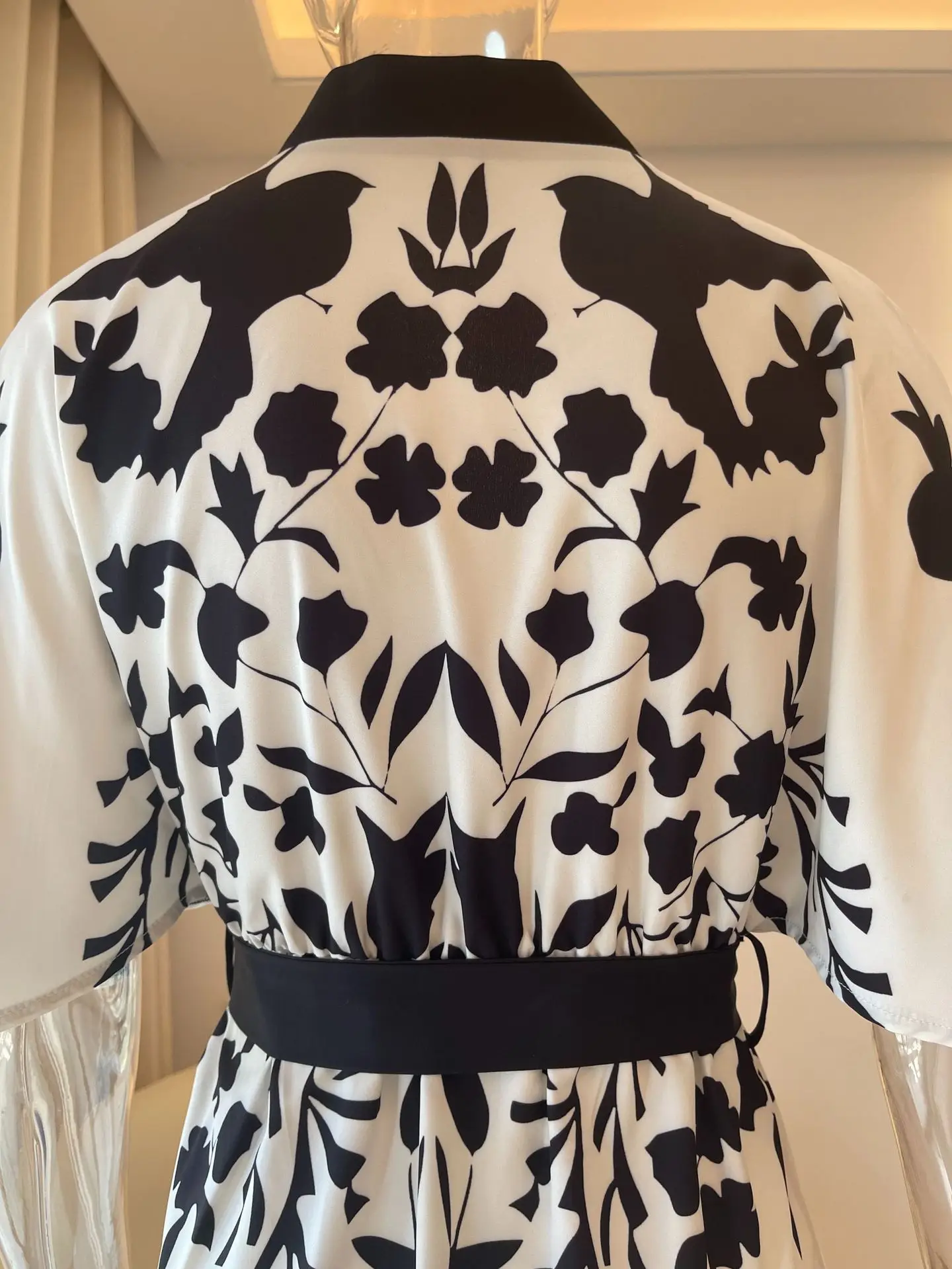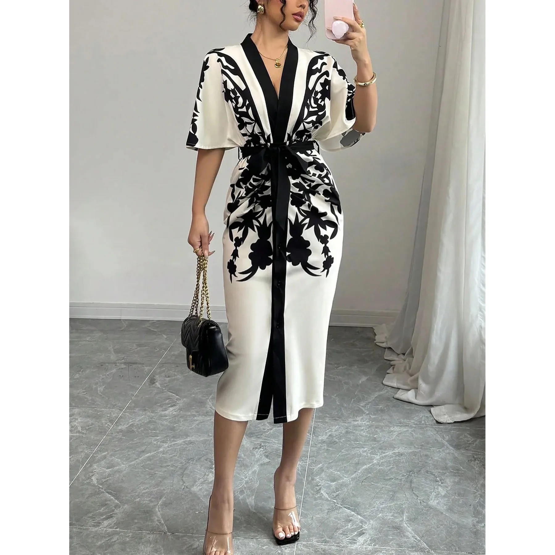 Women's elegant temperament V-neck A-line party dress 2025 new half sleeved printed lace up waist dress
