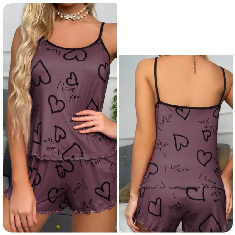 women's heart-shaped printed pajamas set sexy pajamas silk pleated vest shorts set soft and comfortable home wear sweet and cute