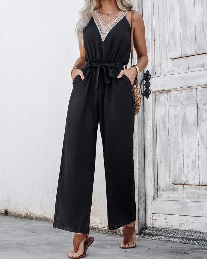 Women's jumpsuit 2025 summer new sleeveless new fashionable hollow camisole buckle comparison mesh tight jumpsuit