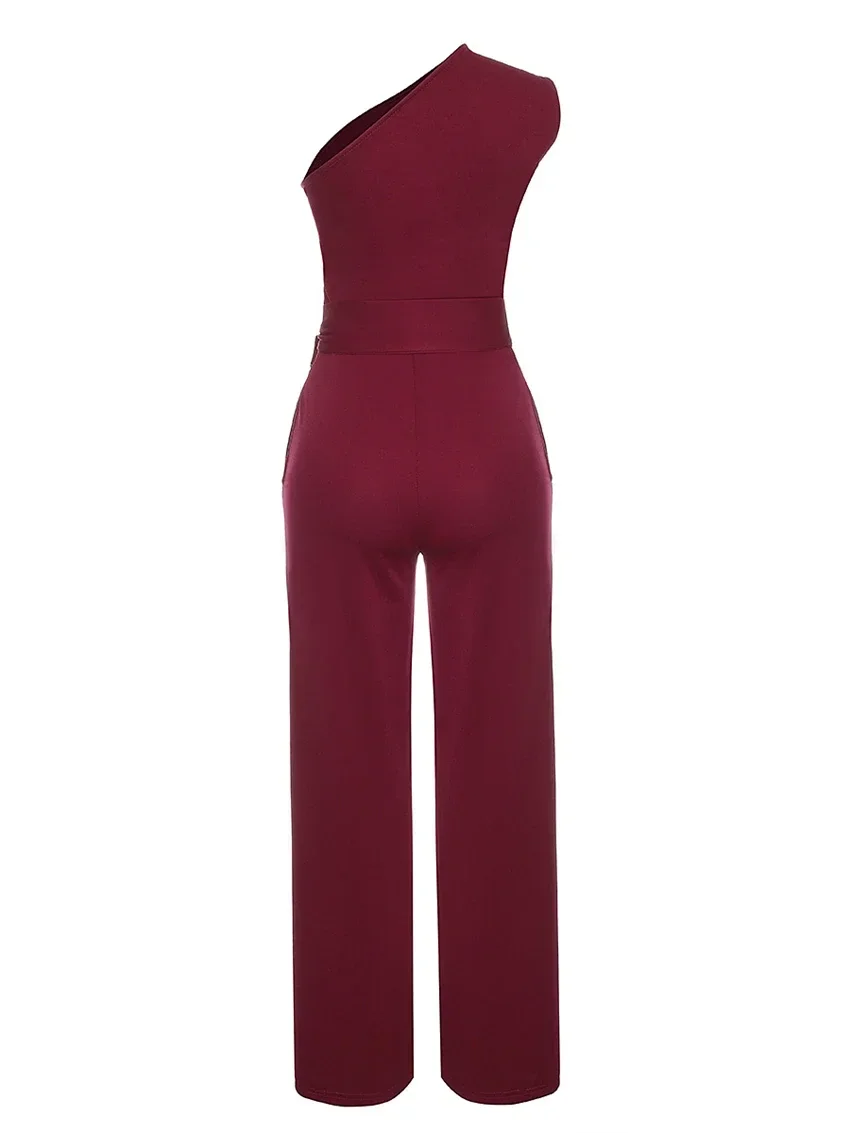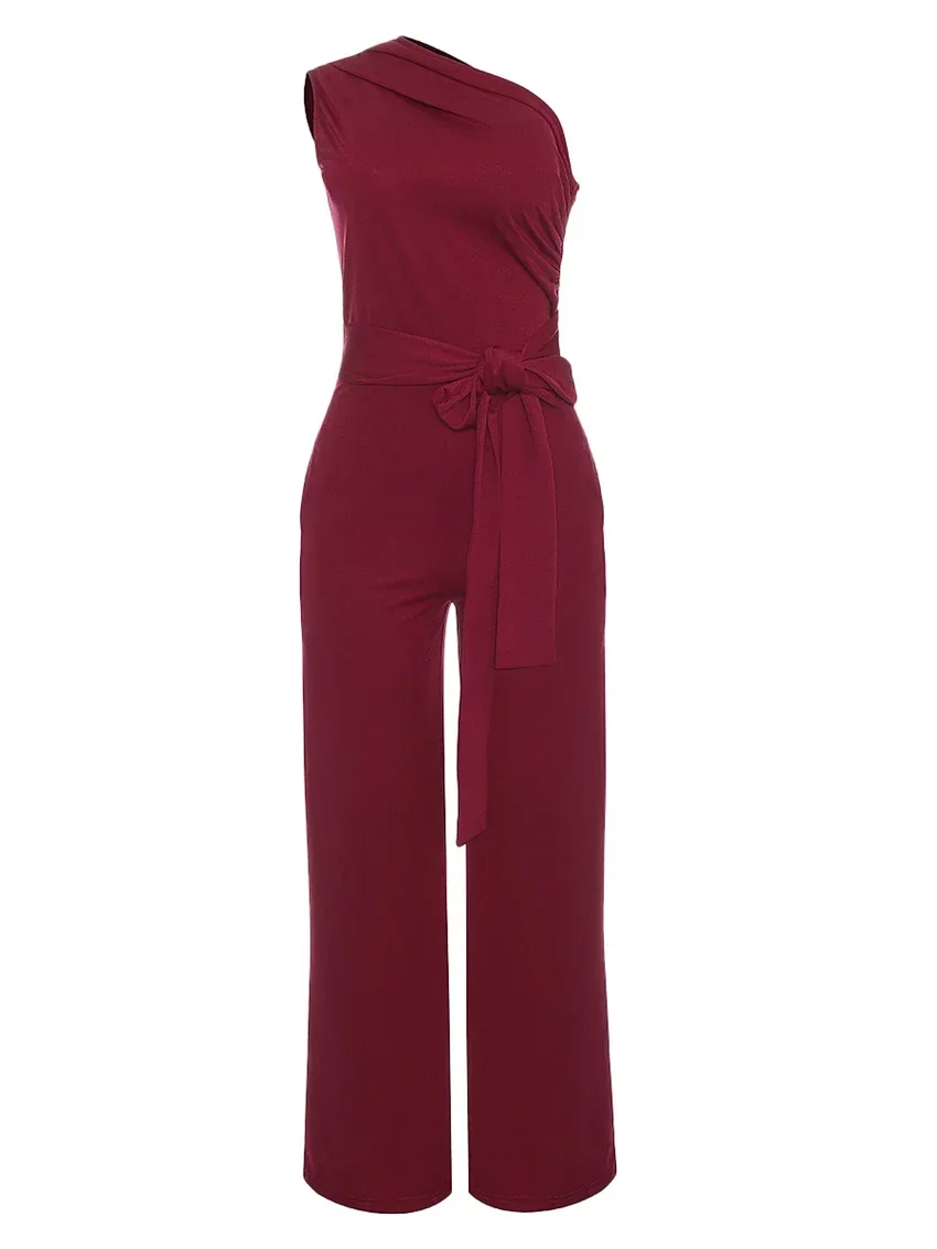 Women's Jumpsuit Solid Skew Collar Crop Top Straight Pants Belt Sexy Sleeveless Loose Pants Elegant Charming Playsuits 2024
