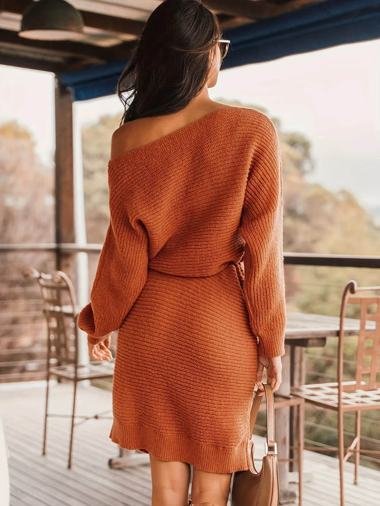 Featuring an elegant asymmetrical neck design, this sweater dress adds a touch of sophistication to any outfit.