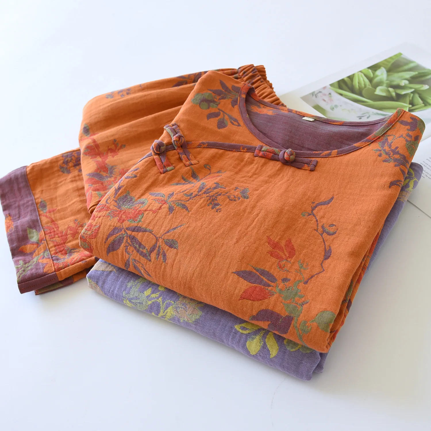 Women's Retro Long-sleeved Trousers Loungewear Set Yarn-dyed Double-sided Jacquard Thin Pajamas Round Neck Chinese Style Pijama