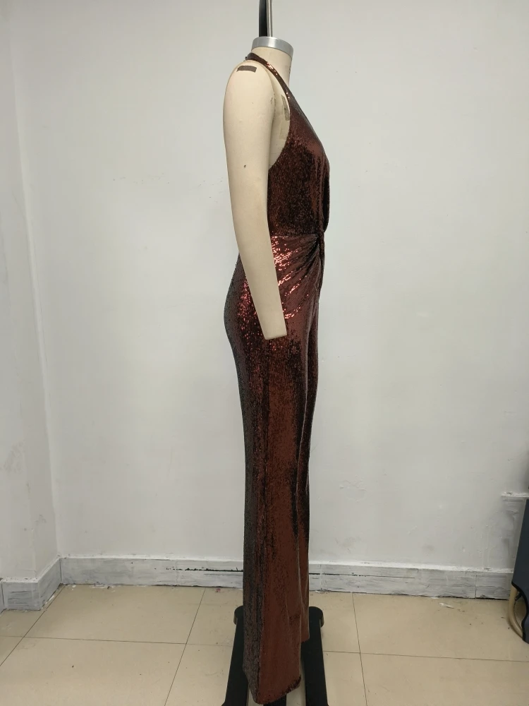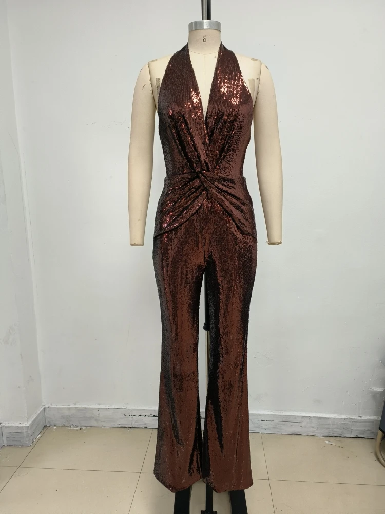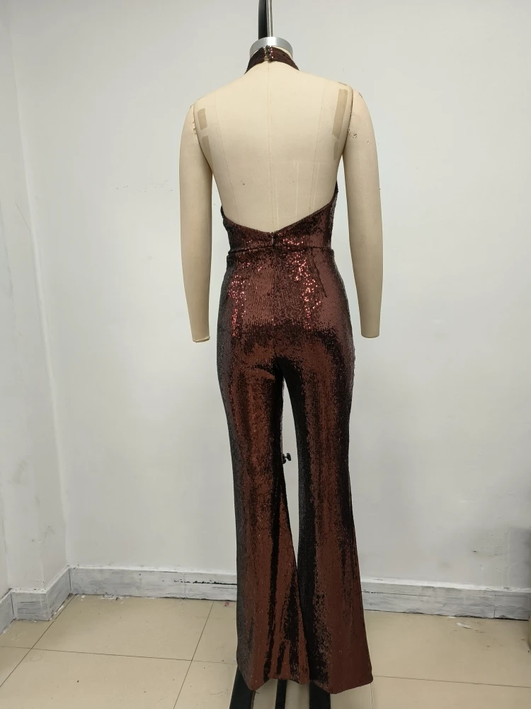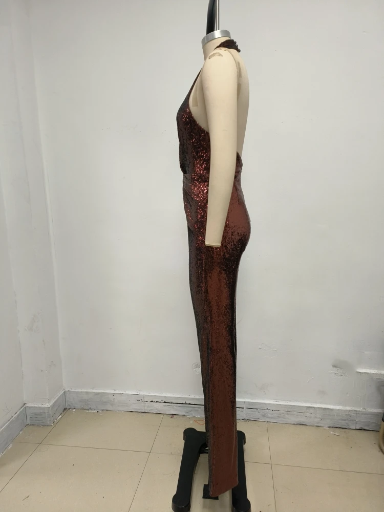 Women's Sleeveless Gold Sequin Jumpsuit Sexy V Neck Sparkle Sequined High Waist Wide Leg Pants Jumpsuit Celebrity Evening Party