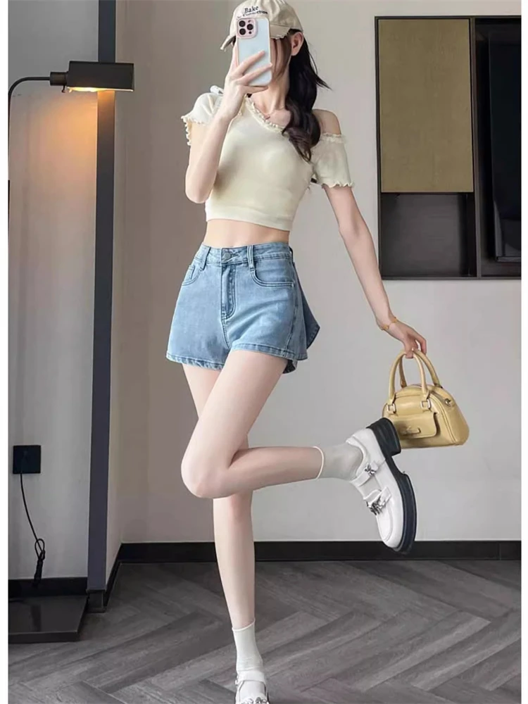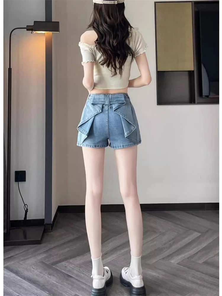 Women Jeans Denim Shorts Mid Waist Sexy Slim Fit Drawstring Pleated Summer 2024 Washing Pockets Slight Strech Solid Regular