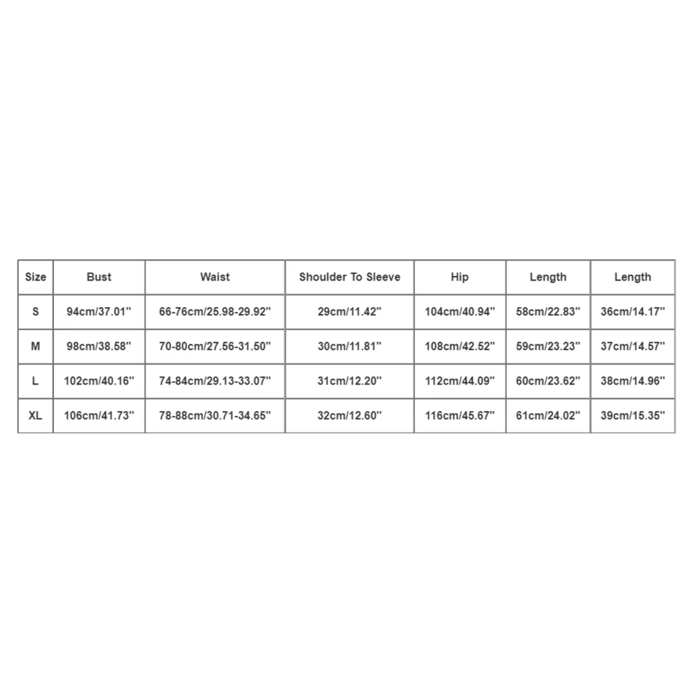 | Size:M | Bust:98cm/38.58'' | Waist:70-80cm/27.56-31.50'' | Shoulder To Sleeve:30cm/11.81'' | Hip:108cm/42.52'' | Length:59cm/23.23'' | Length:37cm/14.57'' |