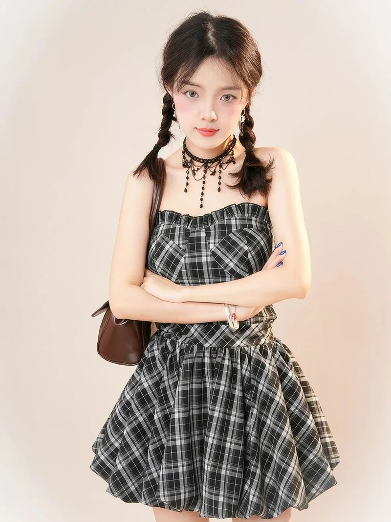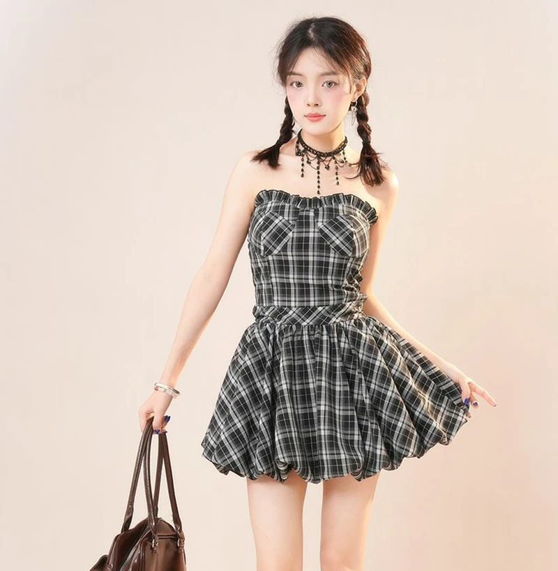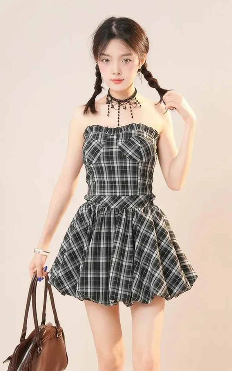Y2K Plaid Mini Dress Women Vintage Backless Patchwork Slim Dress Summer Sexy Bodycon Strapless Aesthetic Lady Vestidos